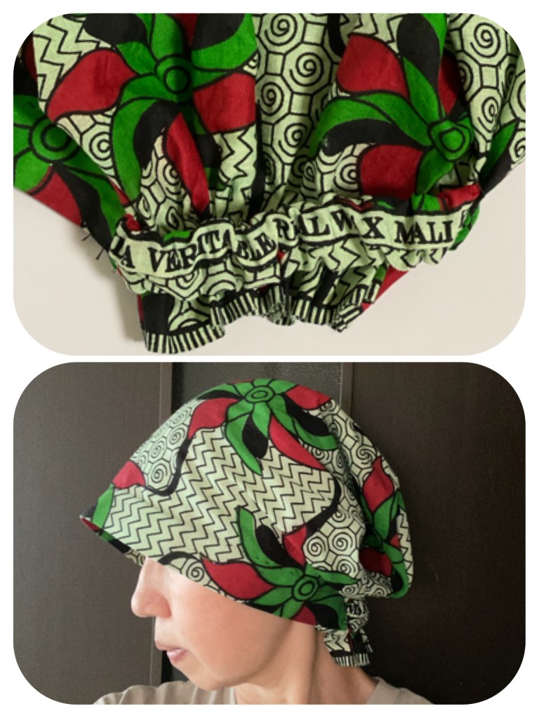 往復徒歩でさっそくタンザニアキルト生地のお手製帽子で