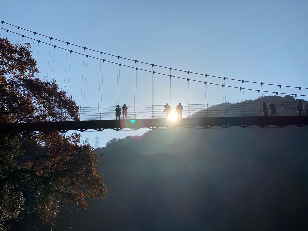 朝日を浴びる吊橋