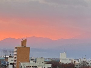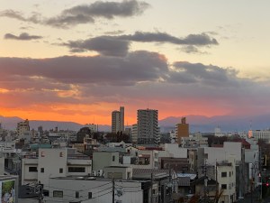 この窓から何度となく眺めた夕陽、本日も良く晴れたためとても美しい