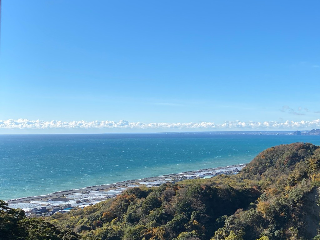 冬の空と海は青が深い、手前はまもなく旬となる石垣いちごのビニールハウス