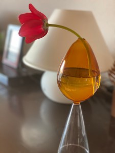 満開となったチューリップは開きすぎた子が頭が重たそうで、どうやって使うのかと思案していた花器に移す
