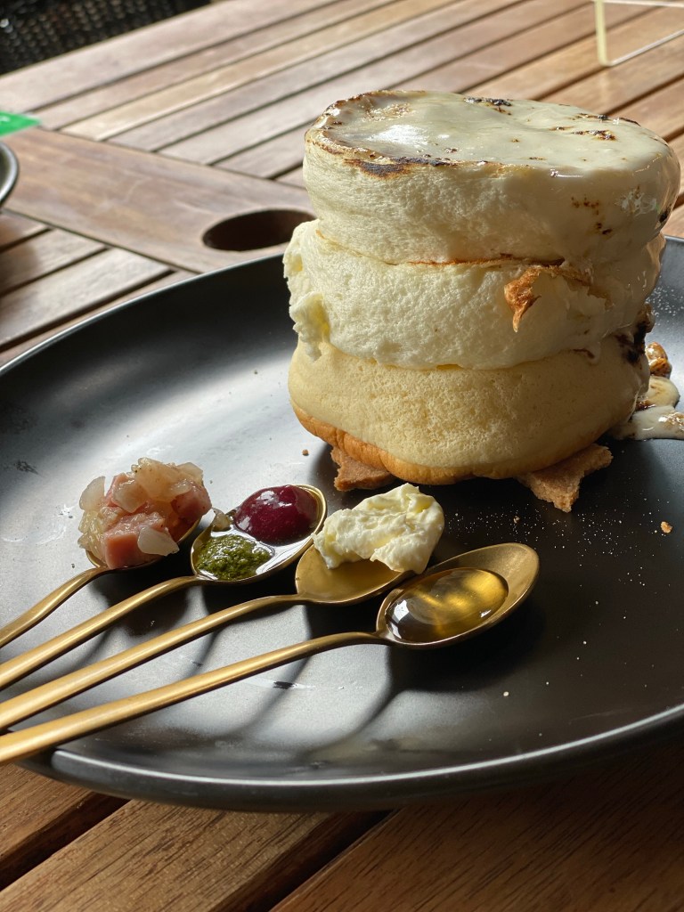 パンケーキにチーゾソースをかけバーナーで炙り、味変用のソース4種付き!