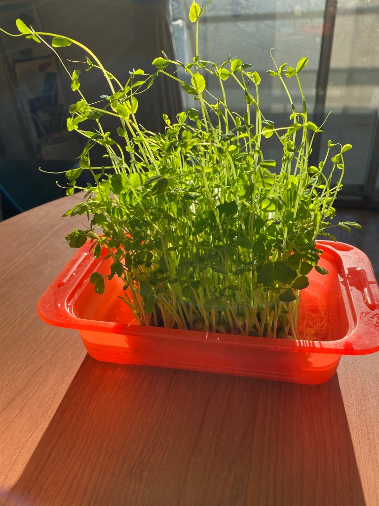 今日は穏やかな天気で阿佐ヶ谷姉妹の真似をして豆苗の根を水につけておいたら、2巡目、収穫できそう