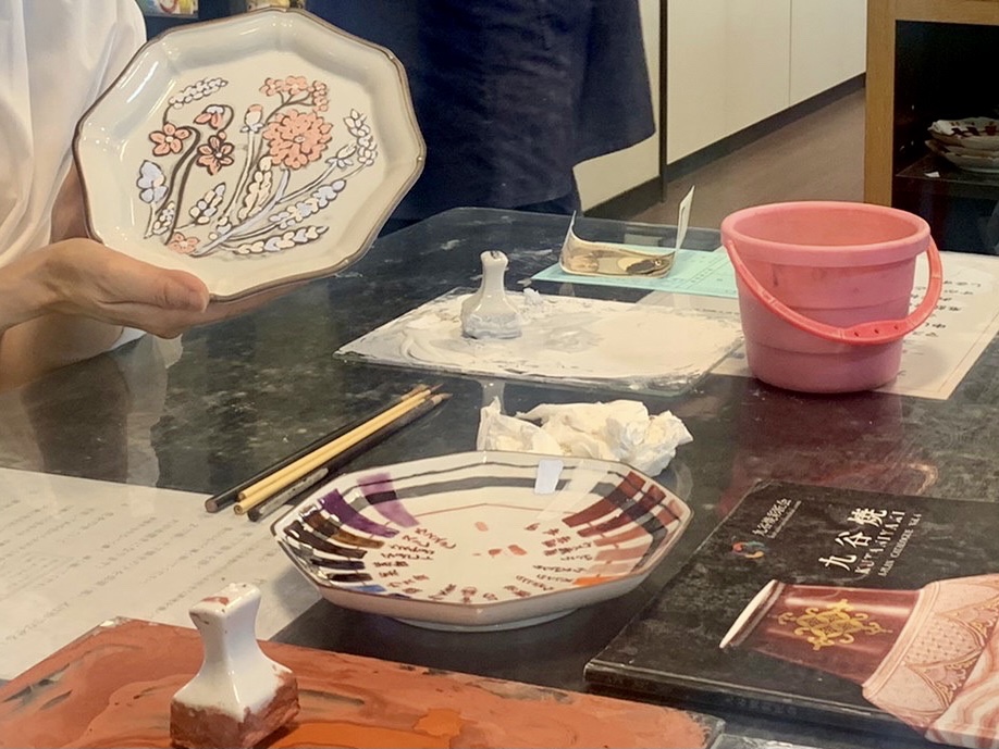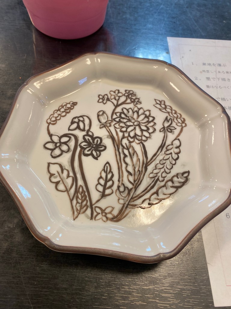 墨で下絵を描いた後、釉薬で輪郭、色塗り