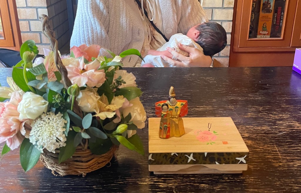 娘はスキップして孫に一刀彫の立ち雛を引き継ぎ