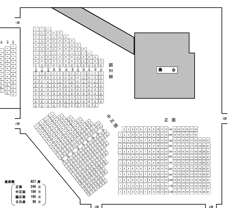 正面、脇正面、中正面とあり、舞台上には角に柱があるので、中正面が若干見にくくなっている